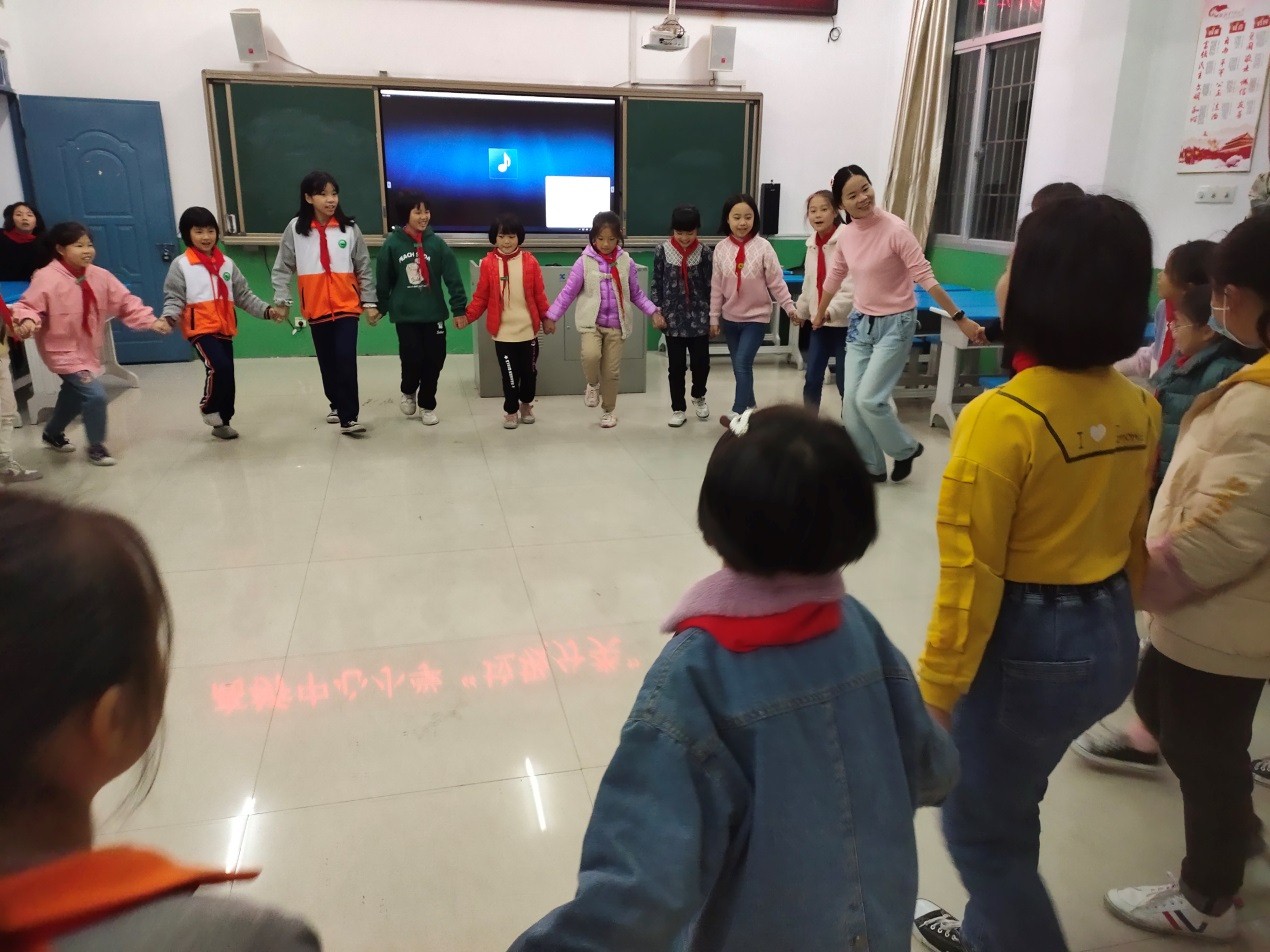 12月3日下午,高桥中心小学“小状元”青少年宫一楼的多媒体教室里传来活泼轻快的音乐声和孩子们欢乐的笑声。爱游戏最新网站|中国有限公司官网童妙老师正以游戏模式,上一堂别样的音乐课。她以“我是一个有魔法的木头人”引入,带领一群孩子围成一个圈,跟随着音乐节奏变换着身体动作——“我是一个木头人,拍拍手呀拍拍手;我是一个木头人,踢踢腿呀踢踢腿;我是一个木头人,跺跺脚呀跺跺脚;……”之后,她将魔法在孩子们中传递,由孩子们轮流担当“有魔法的木头人”,自主创新动作,带领其他同学跟随音乐律动……