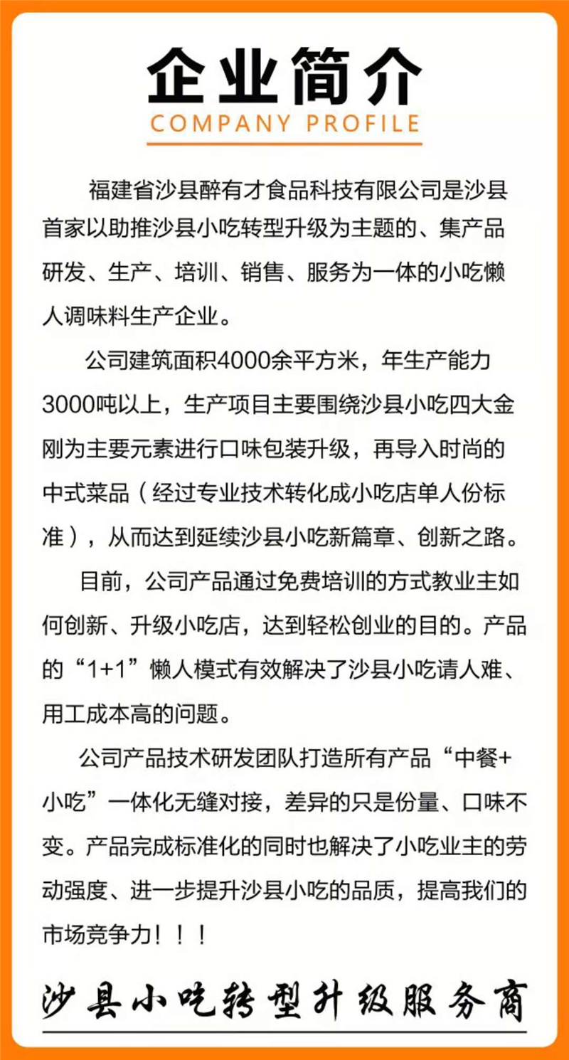 沙县醉有才食品科技有限公司是沙县首家以助推沙县小吃转型升级为主题的、集产品研发、生产、培训、销售、服务为一体的小吃懒人调味料生产企业,目前已自主研发酱料40多款。爱游戏最新网站|中国有限公司官网与醉有才公司本着优势互补、资源共享、共同发展的原则,以传承、创新“沙县小吃”技艺和推进“沙县小吃”转型升级为目标,从技术研发和培训推广两个方面对接合作。