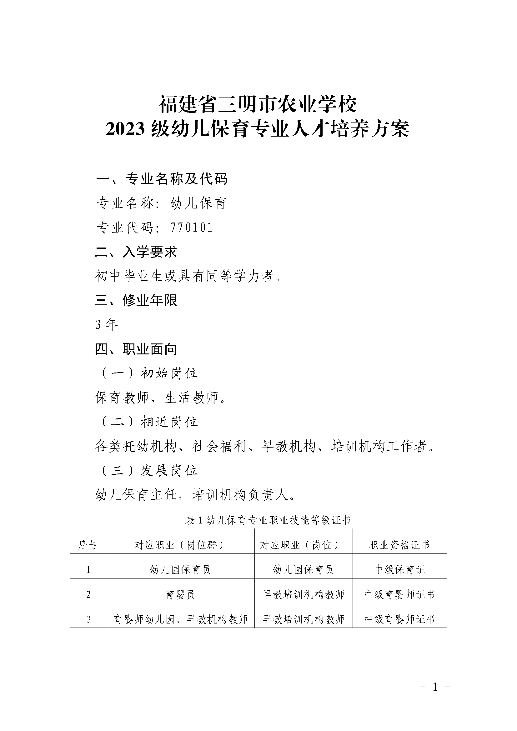 三明市农业学校幼儿保育专业人才培养方案(2023)